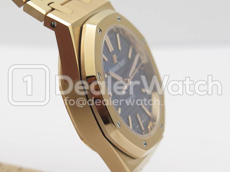 Циферблат синий, гильошированный (Mega Tapisserie). Часовые риски и стрелки Royal Oak, покрытые люминесцентным составом Super LumiNova С1 + С3. Окно даты, расположенное в отметке на 15.00 часов. Сапфировое стекло, с внутренним просветляющим антибликовым покрытием. Фиксированный в одном положении 8 многогранными винтами, позолоченный сатинированный безель грубой шлифовки.
