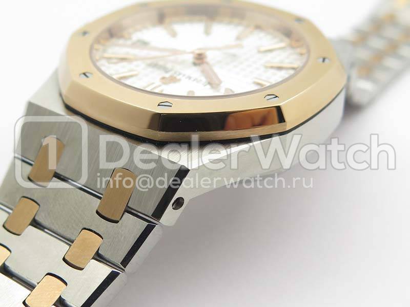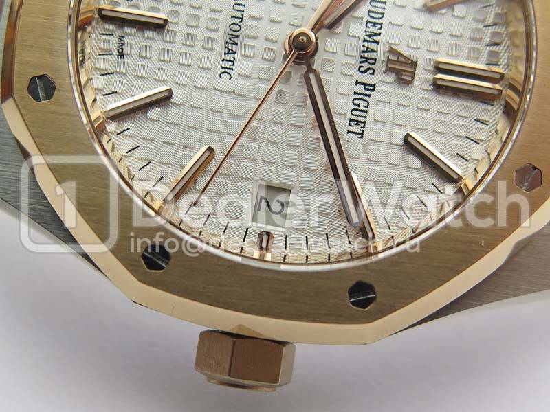 Циферблат белый, гильошированный (Mega Tapisserie). Часовые риски и стрелки Royal Oak, покрытые люминесцентным составом Super LumiNova С1 + С3. Окно даты, расположенное в отметке на 15.00 часов. Сапфировое стекло, с внутренним просветляющим антибликовым покрытием. Фиксированный в одном положении 8 многогранными винтами, позолоченный сатинированный безель грубой шлифовки.