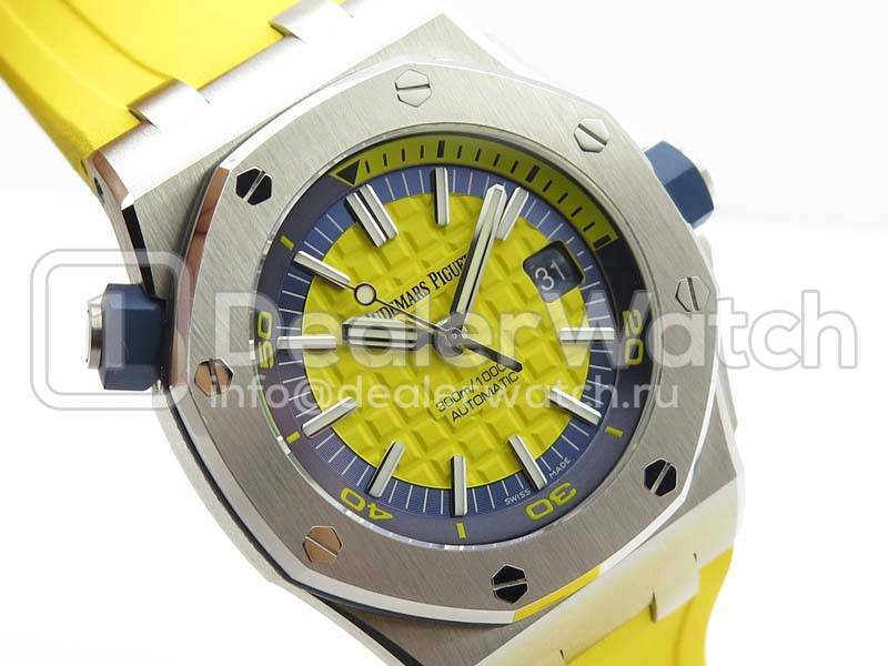 Циферблат желтый, гильошированный (Mega Tapisserie). Часовые риски, дайверские метки на вращающемся внутреннем ранте и стрелки Royal Oak, покрытые люминесцентным составом Super LumiNova С1 + С3. Окно даты в отметке на 15.00 часов под увеличительным окном "2.5". Сапфировое стекло, с внутренним просветляющим антибликовым покрытием и антибликовым покрытием на увеличительном окне. Фиксированный в одном положении 8 многогранными винтами, стальной сатинированный безель грубой шлифовки.