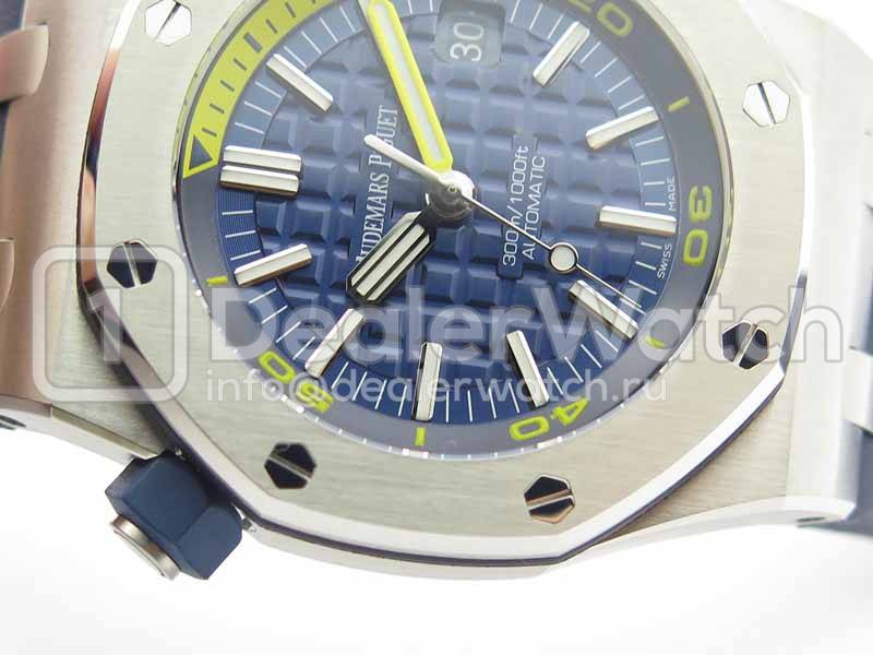 | Циферблат | Синий, гильошированный (Mega Tapisserie). Часовые риски, дайверские метки на вращающемся внутреннем ранте и стрелки Royal Oak, покрытые люминесцентным составом Super LumiNova С1 + С3. Окно даты в отметке на 15.00 часов под увеличительным окном "2.5" |