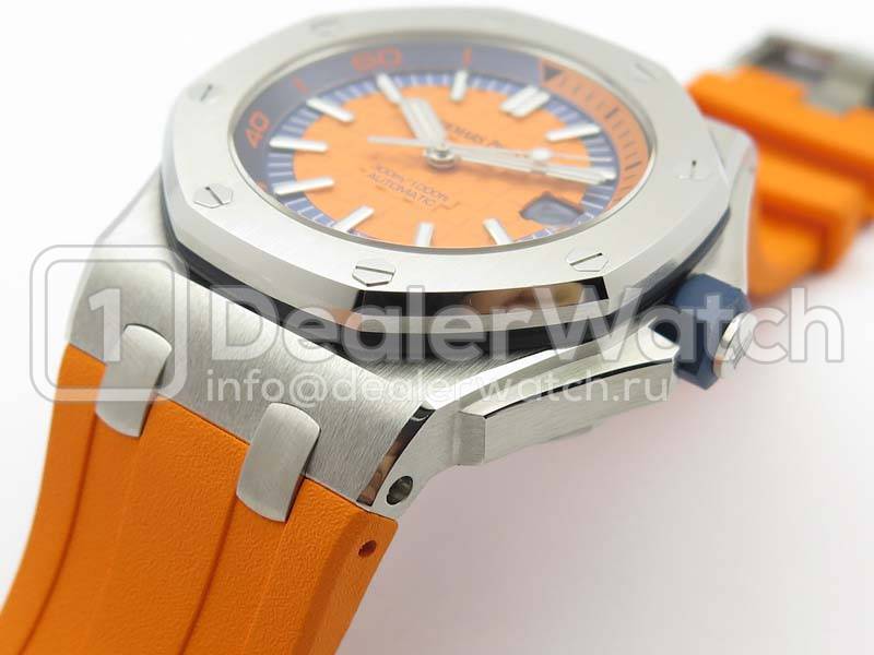 Циферблат оранжевый, гильошированный (Mega Tapisserie). Часовые риски, дайверские метки на вращающемся внутреннем ранте и стрелки Royal Oak, покрытые люминесцентным составом Super LumiNova С1 + С3. Окно даты в отметке на 15.00 часов под увеличительным окном "2.5". Сапфировое стекло, с внутренним просветляющим антибликовым покрытием и антибликовым покрытием на увеличительном окне. Фиксированный в одном положении 8 многогранными винтами, стальной сатинированный безель грубой шлифовки.