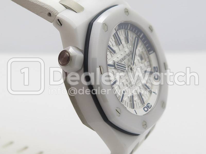 Циферблат белый, гильошированный (Mega Tapisserie). Часовые метки, дайверские метки на вращающемся внутреннем ранте и стрелки Royal Oak, покрытые люминесцентным составом Super LumiNova С1 + С3. Окно даты в отметке на 15.00 часов под увеличительным окном. Сапфировое стекло, с внутренним просветляющим антибликовым покрытием и антибликовым покрытием на увеличительном окне. Фиксированный в одном положении 8 многогранными титановыми винтами, матированный керамический безель.