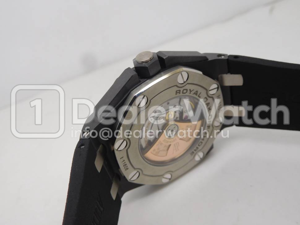 Циферблат черный, гильошированный (Mega Tapisserie). Часовые метки, дайверские метки на вращающемся внутреннем ранте и стрелки Royal Oak, покрытые люминесцентным составом Super LumiNova С1+С3. Окно даты в отметке на 15.00 часов, под увеличительным окном. Сапфировое стекло, с внутренним просветляющим антибликовым покрытием и антибликовым покрытием на увеличительном окне. Фиксированный в одном положении 8 многогранными винтами, черный керамический безель, грубой шлифовки.