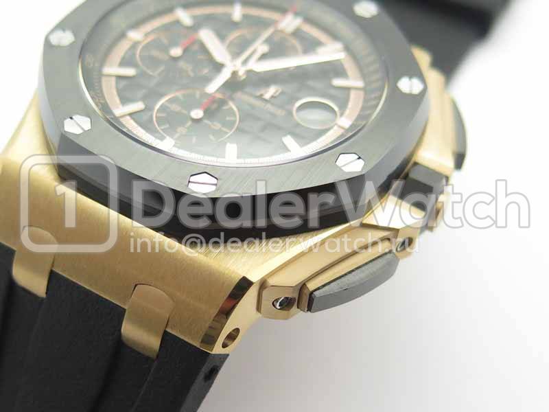 Корпус часов Audemars Piguet Royal Oak Offshore Chronograph 2017 имеет размеры 44 х 15 мм. С сапфировым стеклом, на 8 винтах и гравировкой по радиусу кольца, с указанием серийного номера и маркировки пробы золота. Декорированный и модифицированный механизм. Водозащита часов 10 АТМ.