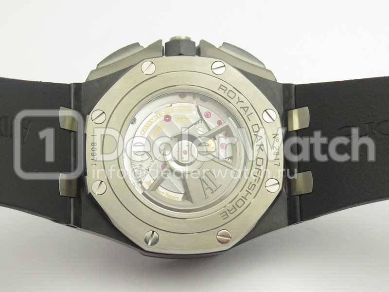 Корпус часов Audemars Piguet Royal Oak Offshore Forged Carbon Chronograph имеет размеры 44 х 15 мм. С сапфировым стеклом, на 8 винтах и гравировкой по радиусу титанового кольца, с указанием серийного номера. Декорированный ротор механизма. Водозащита часов 10 АТМ.