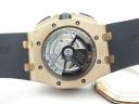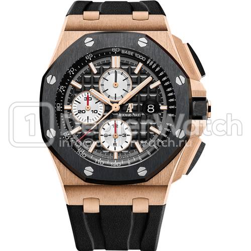 Корпус часов Audemars Piguet Royal Oak Offshore Chronograph 44mm имеет размеры 44 х 15 мм. С сапфировым стеклом, на 8 винтах и гравировкой по радиусу кольца, с указанием серийного номера и маркировки пробы золота. Декорированный и модифицированный механизм. Водозащита часов 5 АТМ.