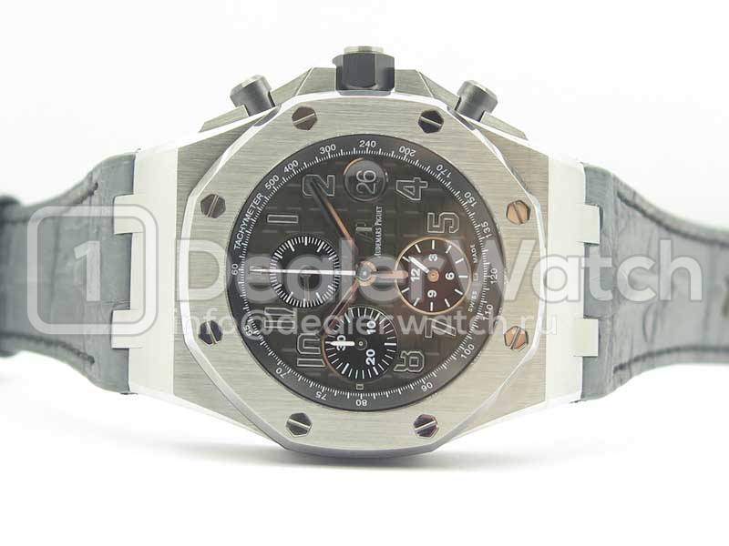 | Ремешок | Серый кожаный ремешок из кожи крокодила, прошитый черными нитками, с двойной раскладывающейся застежкой Audemars Piguet. Либо черный каучуковый ремешок нового образца, с простым замком Audemars Piguet |