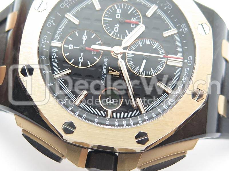 | Ремешок | Черный каучуковый ремешок Royal Oak Offshore нового образца, с простым (с помощью шипа) позолоченным замком Audemars Piguet |