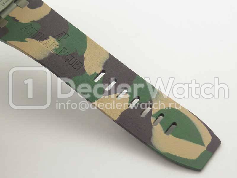 | Ремешок | Зелёный камуфляжный каучуковый ремешок Royal Oak Offshore нового образца, с простым (с помощью шипа) титановым замком Audemars Piguet |
