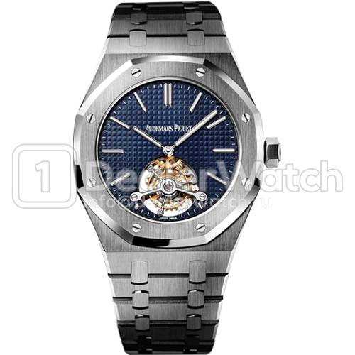 Циферблат синий, гильошированный (Mega Tapisserie). Часовые риски и стрелки Royal Oak, покрытые люминесцентным составом Super LumiNova С3. Декорированная, ось одноминутного парящего турбийона, расположенного в отметке на 18.00 часов. Сапфировое стекло, с внутренним просветляющим антибликовым покрытием. Фиксированный в одном положении 8 многогранными винтами, стальной сатинированный безель грубой шлифовки.