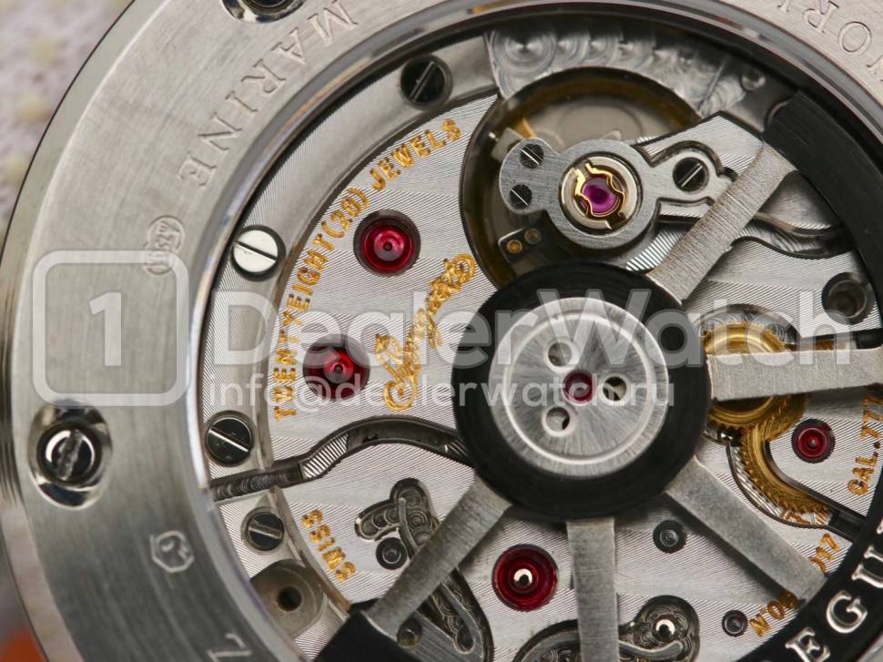 Корпус часов Breguet Marine Automatic 5517 40 mm имеет размеры 40 х 13 мм. Выпуклая задняя крышка на 6 винтах и гравировкой по радиусу полированного кольца, с указанием серийного номера. Водозащита часов 5 АТМ.