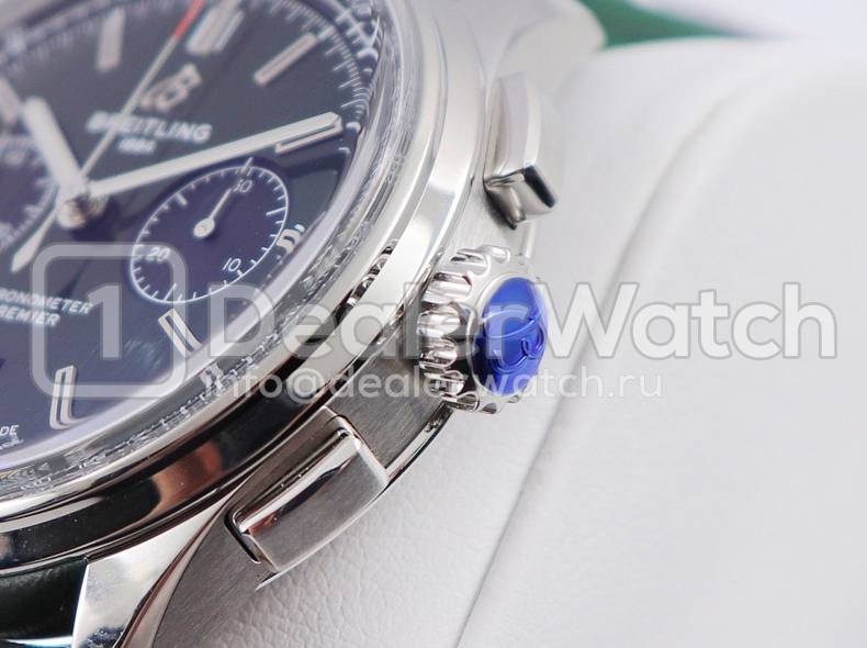 В комплекте с часами Premier поставляется чёрный кожаный ремешок, с простым (с помощью шипа) замком Breitling