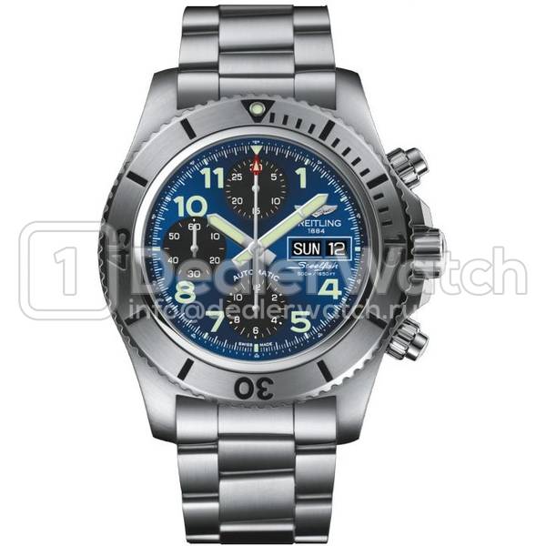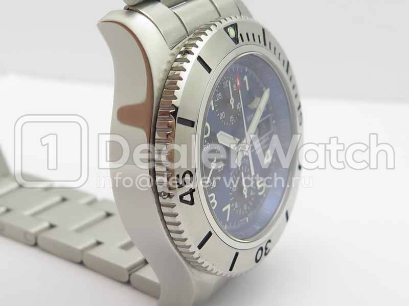 Циферблат синий. Часовые индексы и мечевидные стрелки, покрытые люминесцентным составом Super LumiNova С1. Счетчики хронографа в отметках на 18 и 12.00 часов и малая секундная стрелка в отметке на 21.00 часов. Окно даты и день недели в отметке на 15.00 часов. Выпуклое сапфировое стекло, с двойным просветляющим антибликовым покрытием. Однонаправленный, вращающийся безель из сатинированной стали, с гравировкой минутных меток и направляющей люминесцентной меткой в отметке на 12.00 часов.