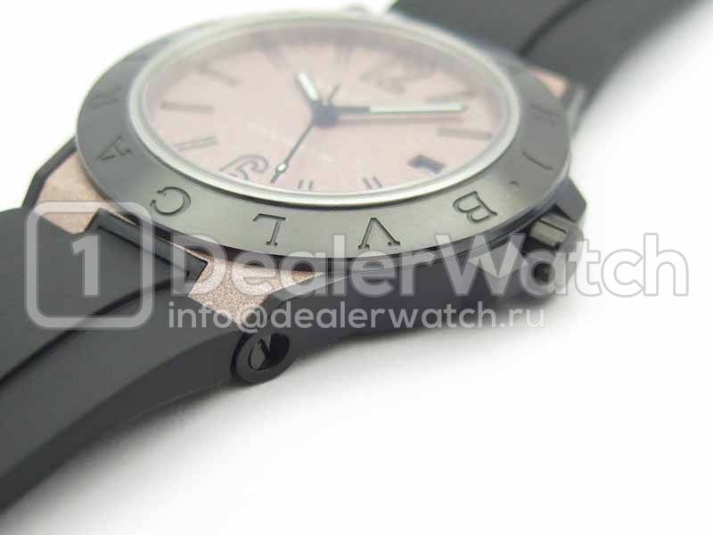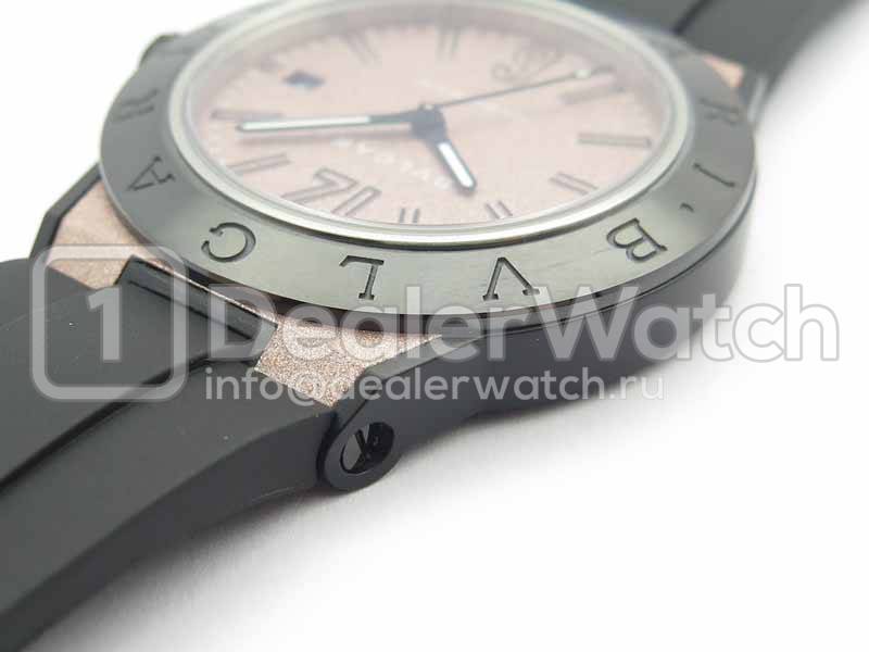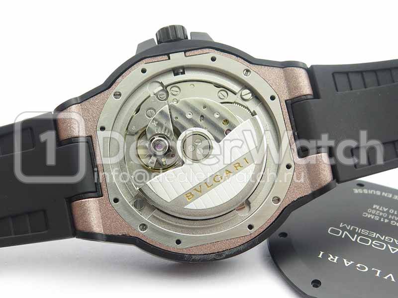 Корпус часов Bvlgari Diagono Magnesium Automatic Pink имеет размеры 41 х 9,5 мм. Стальная задняя крышка на 8 винтах и гравировкой по радиусу, с указанием серийного номера. Водозащита часов 10 АТМ.