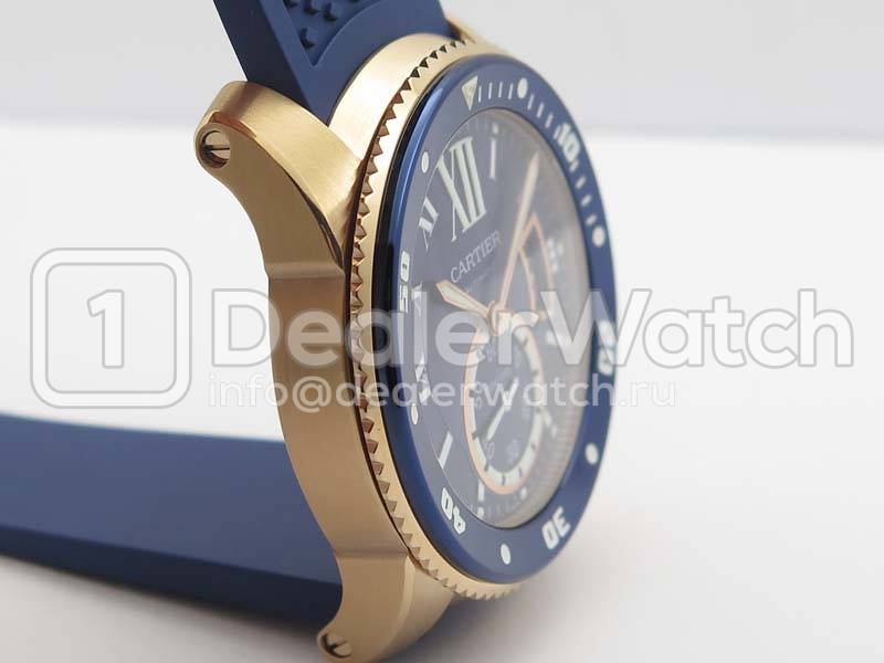| Ремешок | Синий каучуковый ремешок нового образца Cartier Diver, с классической (с помощью шипа), позолоченной застежкой Cartier |