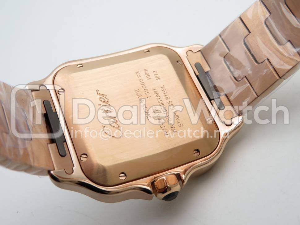 Корпус часов Cartier Santos Large имеет размеры 40 x 48 х 9.0 мм. На 8 винтах из сатинированной стали и гравировкой по радиусу, с указанием серийного номера. Индивидуальный серийный номер. Водозащита часов 5 АТМ.
