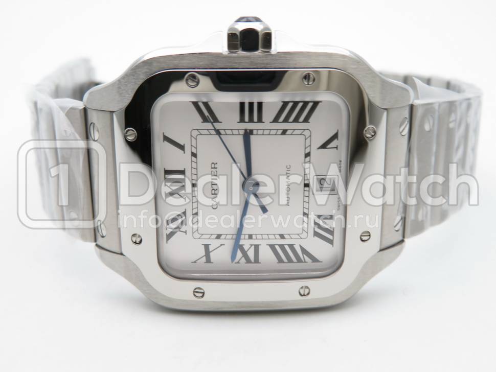 Корпус часов Cartier Santos Large имеет размеры 40 x 48 х 9.0 мм. На 8 винтах из сатинированной стали и гравировкой по радиусу, с указанием серийного номера. Индивидуальный серийный номер. Водозащита часов 5 АТМ.
