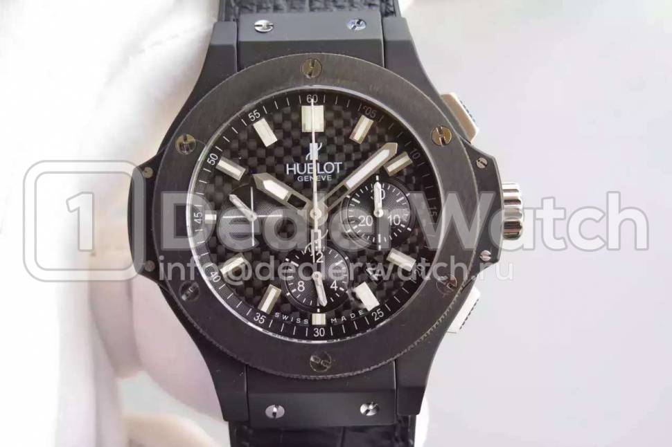 Циферблат черный, углерод. Стальные сатинированные часовые метки и мечевидные стрелки, покрытые белым люминесцентным составом. Счетчики хронографа в отметках на 15 и 18.00 часов и малая секундная стрелка в отметке на 21.00 часов. Окно даты в отметке на 16.30 часов. Сапфировое стекло, с двухсторонним антибликовым покрытием. Фиксированный в одном положении 6 Н-образными титановыми винтами, керамический матовый черный безель.