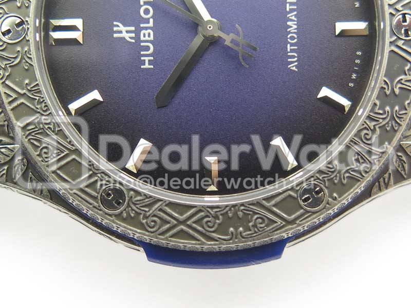 Корпус часов Hublot Classic Fusion Arturo Fuente 45mm Blue имеет размеры 45 х 9.5 мм. Из сатинированной стали на 6 винтах и детальной гравировкой по радиусу и по центру, с указанием номера из специальной лимитированной серии. Водозащита часов 5 АТМ.