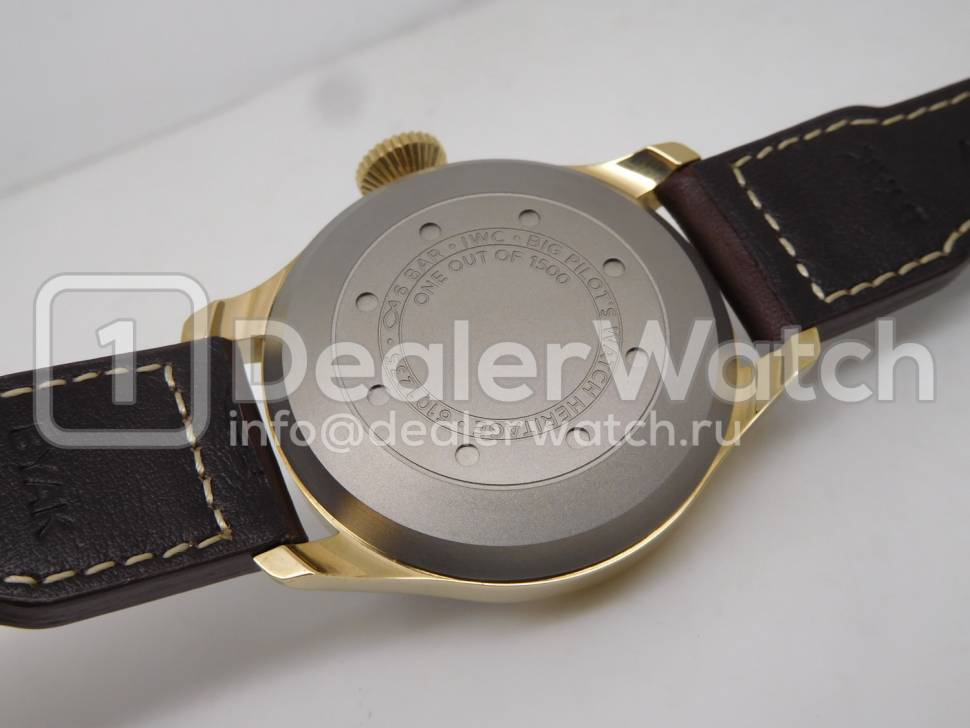 Корпус часов IWC Big Pilot Watch Heritage имеет размеры 46.2 х 15.4 мм. Выпуклая завинчивающаяся задняя крышка из титана и гравировкой по радиусу и по центру, с указанием номера из специальной лимитированной серии в 1500 экземпляров. Водозащита часов 5 АТМ.
