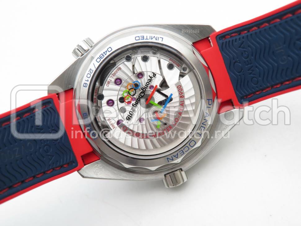 Корпус часов Omega Seamaster Planet Ocean 600M 43.5mm "Pyeongchang 2018" имеет размеры 43.5 х 15,2 мм. Стальная завинчивающаяся задняя крышка с сапфировым стеклом и гравировкой по радиусу кольца, с указанием серийного номера на душке корпуса. Индивидуальный серийный номер. Водозащита часов 10 АТМ.