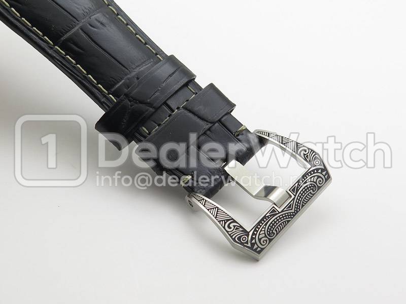 | Ремешок | Черный кожаный ремешок, прошитый белыми нитками, с простым (с помощью шипа) V-образным замком Panerai из сатинированной стали |