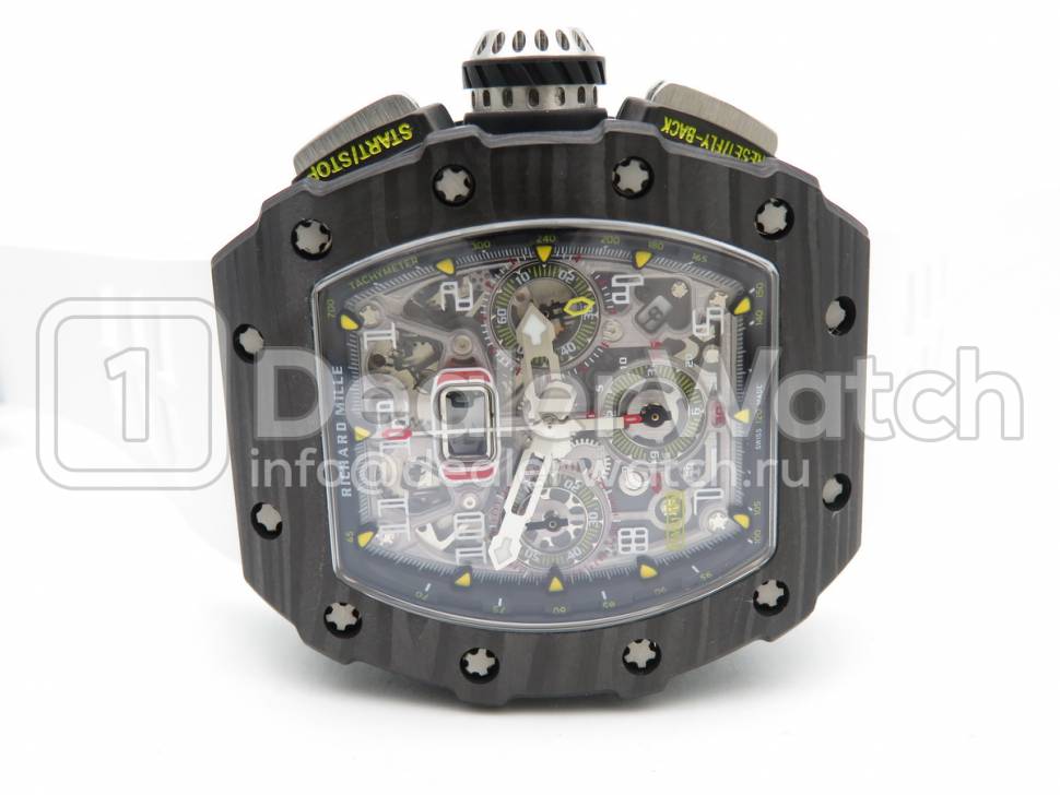 Корпус часов Richard Mille RM 011-03 Flyback Chronograph Carbon NTPT имеет размеры 42 х 50 х 17.4 мм. Карбоновая задняя крышка с сапфировым стеклом, покрытым антибликовым покрытием и гравировкой по радиусу, с указанием номера из лимитированной серии. Декорированный и модифицированный механизм. Водозащита часов 5 АТМ.