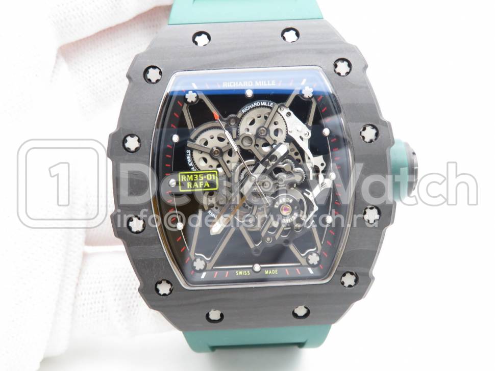 Корпус часов Richard Mille RM 035-01 Rafael Nadal Carbon имеет размеры 42 х 17 мм. Крышка из карбонового волокна на 8 многогранных винтах и гравировкой по радиусу, с указанием серийного номера. Водозащита часов 5 АТМ.