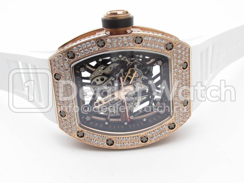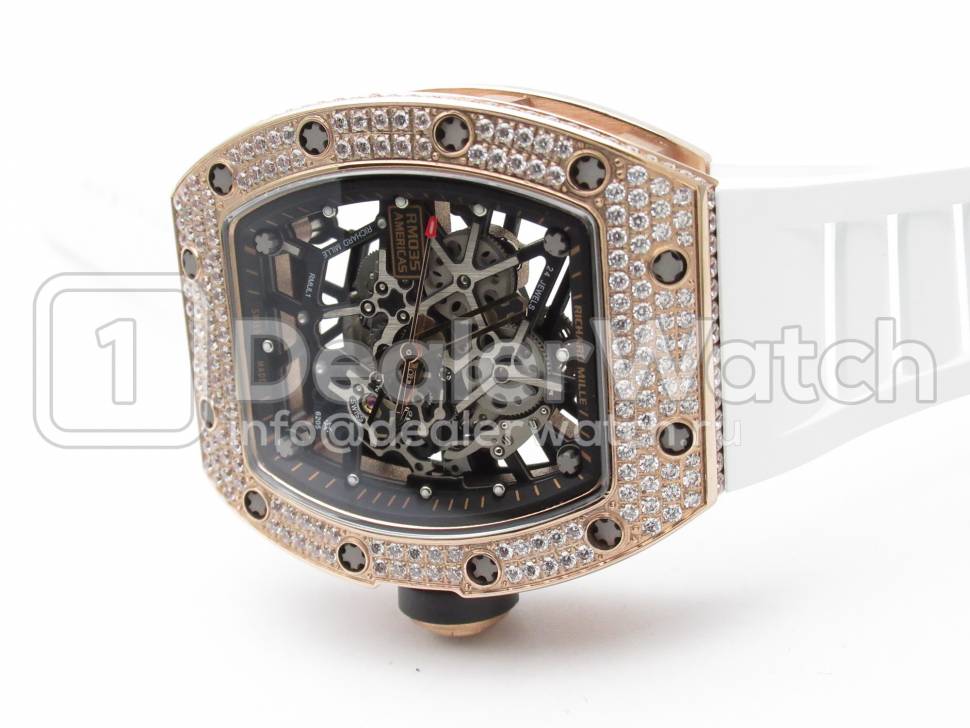 Корпус часов Richard Mille RM 035 Americas Diams имеет размеры 42 х 17 мм. С сапфировым стеклом, покрытым внутренним просветляющим антибликовым покрытием на 8 многогранных винтах и гравировкой по радиусу, с указанием серийного номера. Декорированный механизм. Водозащита часов 5 АТМ.