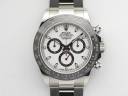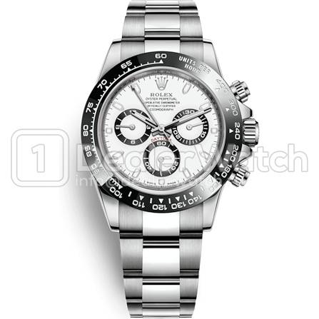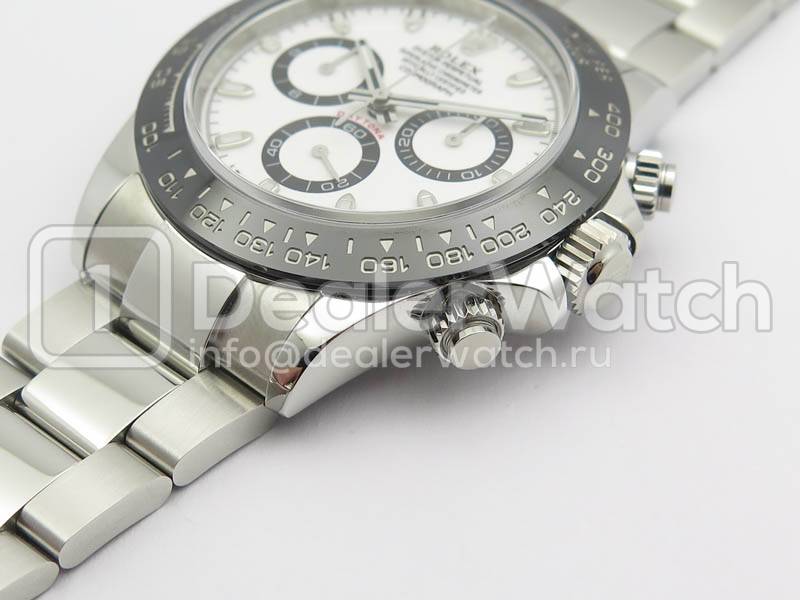 Циферблат белый. Часовые риски и полированные стрелки, покрытые люминесцентным составом Super Lumonova C3. Малые циферблаты хронографа и циферблат малой секундной стрелки, расположенный в отметке на 18.00 ч. Сапфировое стекло, с гравировкой коронки Rolex на стекле в отметке на 18.00 часов. Фиксированный в одном положении, черный полированный керамический безель, с тахиметрической шкалой, разграниченной до 400 км.