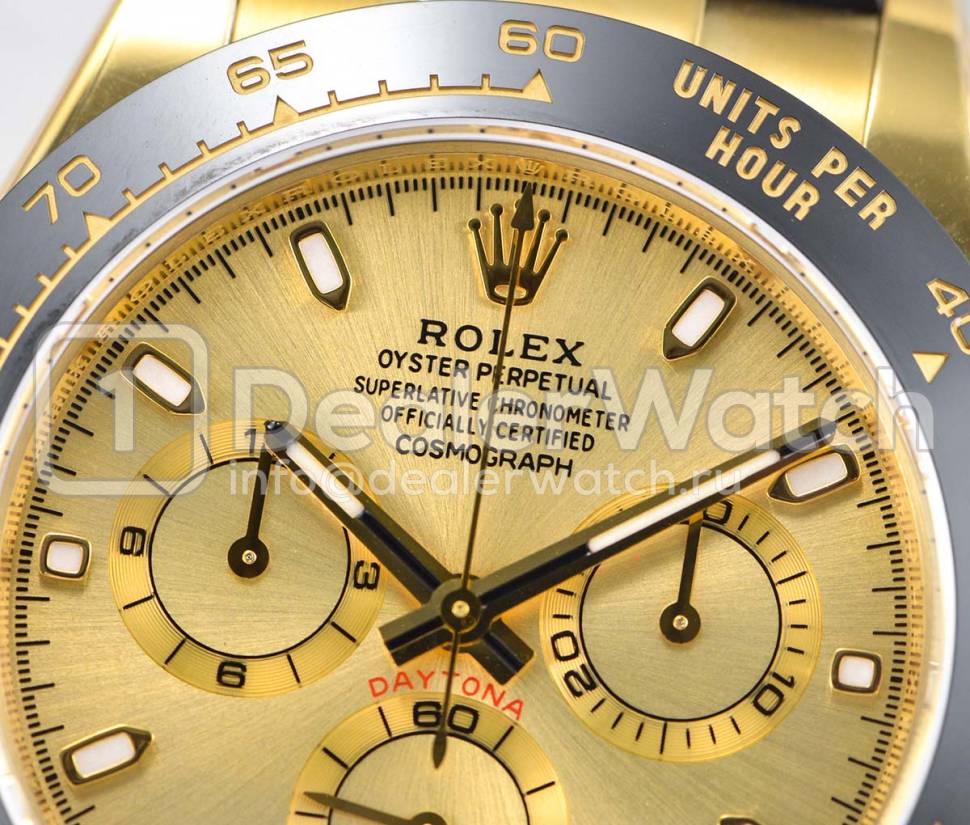 Циферблат позолоченный, переливающийся (Champagne). Черные часовые риски и золотые стрелки, покрытые белым люминесцентным составом Super Lumonova C3. Малые циферблаты хронографа и циферблат малой секундной стрелки, расположенный в отметке на 18.00 часов. Сапфировое стекло, с гравировкой коронки Rolex на стекле в отметке на 18.00 часов. Фиксированный в одном положении, черный полированный керамический безель, с тахиметрической шкалой, разграниченной до 400 км.
