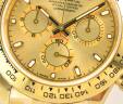 Циферблат позолоченный, переливающийся. Позолоченные часовые риски, инкрустированные багетами сапфира. Малые циферблаты хронографа и циферблат малой секундной стрелки, расположенный в отметке на 18.00 часов. Сапфировое стекло, с гравировкой коронки Rolex на стекле в отметке на 18.00 часов. Фиксированный в одном положении, позолоченный полированный безель, с тахиметрической шкалой, разграниченной до 400 км.