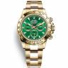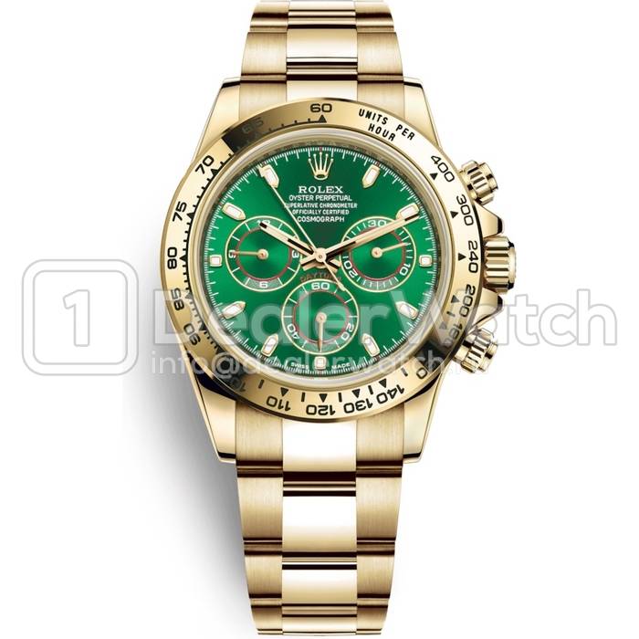 Циферблат зеленый, переливающийся («солнечные лучи»). Позолоченные часовые риски и полированные стрелки, покрытые люминесцентным составом Super Lumonova C3. Малые циферблаты хронографа и циферблат малой секундной стрелки, расположенный в отметке на 18.00 ч. Сапфировое стекло, с гравировкой коронки Rolex на стекле в отметке на 18.00 часов. Фиксированный в одном положении, позолоченный полированный безель, с тахиметрической шкалой, разграниченной до 400 км.