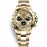 Циферблат позолоченный, переливающийся (Champagne). Черные часовые риски и золотые стрелки, покрытые белым люминесцентным составом Super Lumonova C3. Малые циферблаты хронографа и циферблат малой секундной стрелки, расположенный в отметке на 18.00 часов. Сапфировое стекло, с гравировкой коронки Rolex на стекле в отметке на 18.00 часов. Фиксированный в одном положении, черный полированный керамический безель, с тахиметрической шкалой, разграниченной до 400 км.
