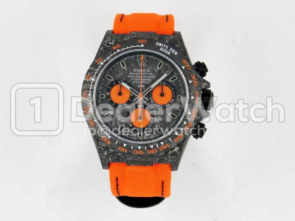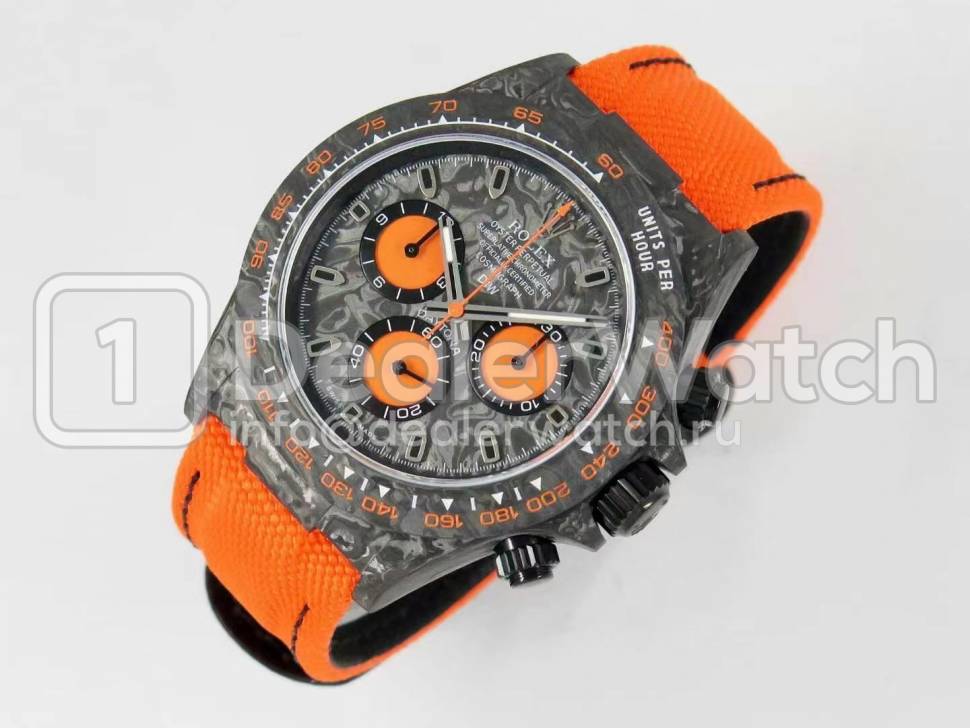 Корпус часов Rolex Cosmograph Daytona Carbon Orange edition имеет размеры 40 x 12.4мм. Выпуклая завинчивающаяся задняя крышка. Гравировка маркировки Rolex с внутренней стороны крышки и между дужками корпуса. Водозащита часов 5 АТМ.