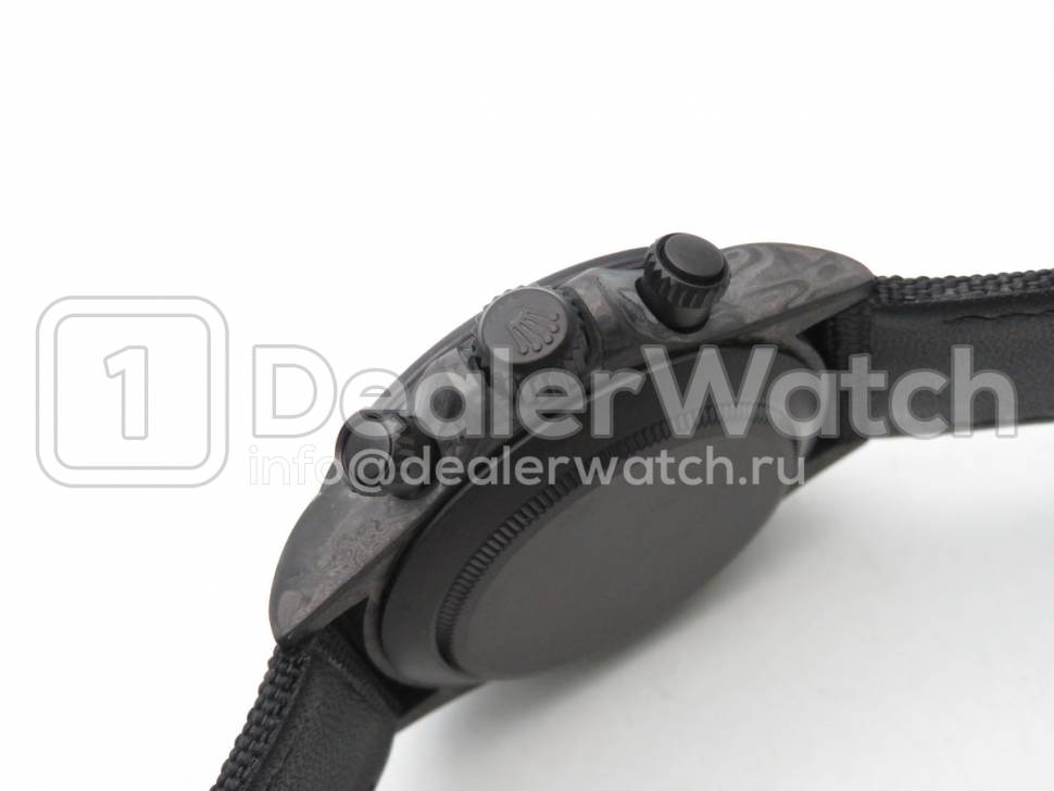 Корпус часов Rolex Cosmograph Daytona Carbon All black имеет размеры 40 x 14мм. Выпуклая завинчивающаяся задняя крышка. Гравировка маркировки Rolex с внутренней стороны крышки и между дужками корпуса. Водозащита часов 5 АТМ.