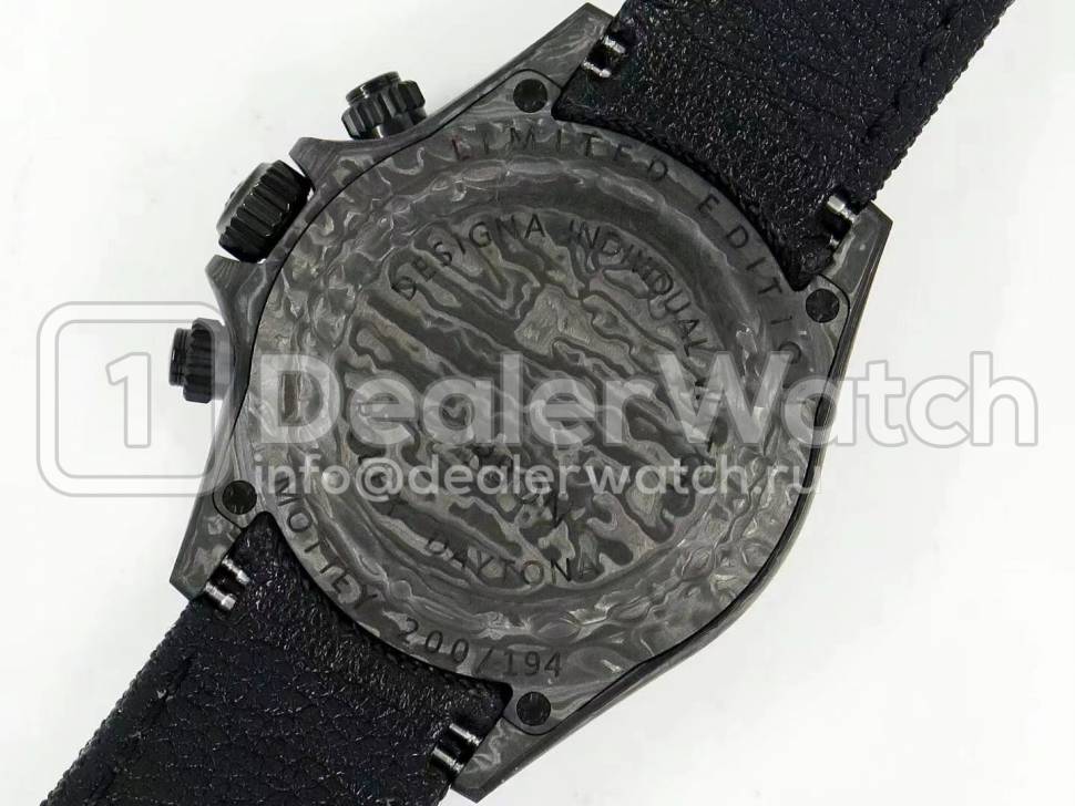 Корпус часов Rolex Cosmograph Daytona Carbon Motley имеет размеры 40 x 12.4мм. Выпуклая завинчивающаяся задняя крышка. Гравировка маркировки Rolex с внутренней стороны крышки и между дужками корпуса. Водозащита часов 5 АТМ.