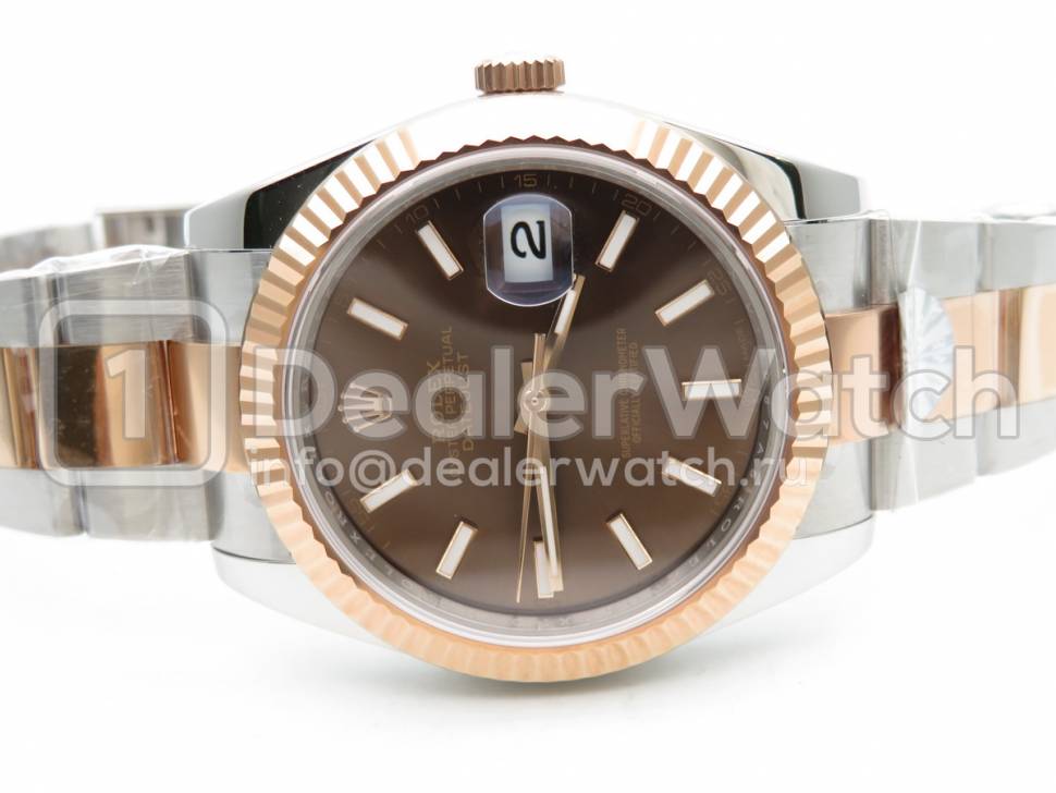 Циферблат коричневый, переливающийся. Часовые риски и полированные стрелки, покрытые люминесцентным составом Super LumiNova С3. Окно даты в отметке на 15.00 ч. под увеличительным окном 2,5. Гравировка маркировки Rolex и серийного номера Rolex на внутреннем ранте. Сапфировое стекло, с антибликовым покрытием на увеличительной линзе и гравировкой коронки Rolex на стекле в отметке на 18.00 часов. Фиксированный в одном положении золотой рифленый безель.