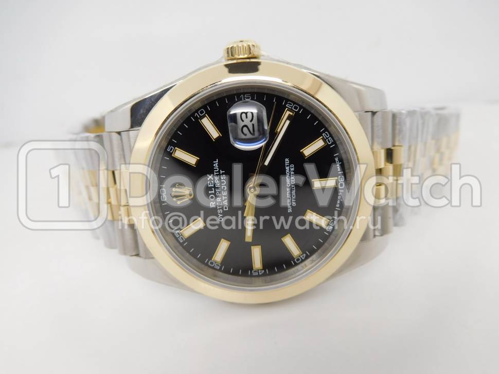 Циферблат черный, переливающийся. Часовые риски и полированные стрелки, покрытые люминесцентным составом Super LumiNova С3. Окно даты в отметке на 15.00 часов под увеличительным окном 2,5. Гравировка маркировки Rolex и серийного номера Rolex на внутреннем ранте. Сапфировое стекло, с антибликовым покрытием на увеличительном циклопе и гравировкой коронки Rolex на стекле в отметке на 18.00 часов. Фиксированный в одном положении позолоченный безель.