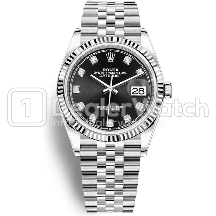 Корпус часов Rolex DateJust 36mm 126234 имеет размеры 36 х 11.8 мм. Выпуклая завинчивающаяся задняя крышка из сатинированной стали. Гравировка маркировки Rolex с внутренней стороны крышки и на конечных звеньях браслета. Декорированный и модифицированный механизм. Водозащита часов 10 АТМ.