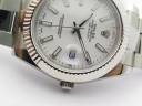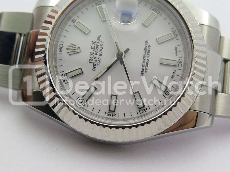 Циферблат белый. Часовые риски и полированные стрелки, покрытые люминесцентным составом Super LumiNova С3. Окно даты в отметке на 15.00 часов под увеличительным окном 2,5. Гравировка маркировки Rolex и серийного номера Rolex на внутреннем ранте. Сапфировое стекло, с антибликовым покрытием на увеличительном циклопе и гравировкой коронки Rolex на стекле в отметке на 18.00 часов. Фиксированный в одном положении полированный рифленый безель, покрытый белым золотом.