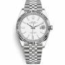 Циферблат белый. Часовые риски и полированные стрелки, покрытые люминесцентным составом Super LumiNova С3. Окно даты в отметке на 15.00 часов под увеличительным окном 2,5. Гравировка маркировки Rolex и серийного номера Rolex на внутреннем ранте. Сапфировое стекло, с антибликовым покрытием на увеличительном циклопе и гравировкой коронки Rolex на стекле в отметке на 18.00 часов. Фиксированный в одном положении полированный рифленый безель, покрытый белым золотом.