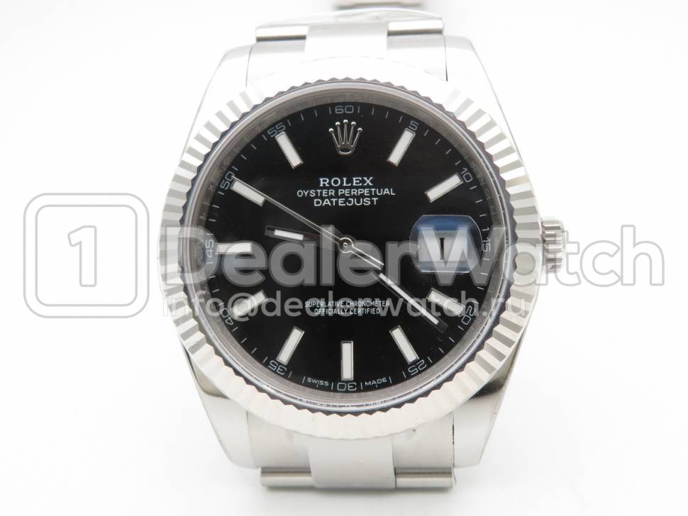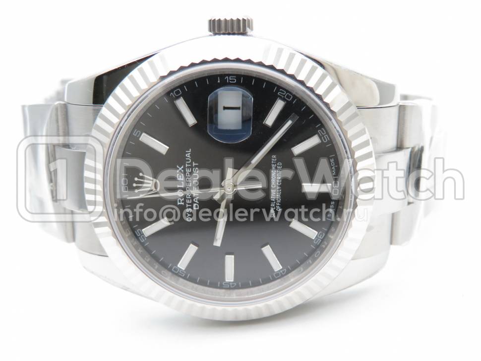 Циферблат черный, переливающийся. Часовые риски и 3D полированные стрелки, покрытые люминесцентным составом Super LumiNova С3. Окно даты в отметке на 15.00 часов под увеличительным окном 2,5. Гравировка маркировки Rolex и серийного номера Rolex на внутреннем ранте. Сапфировое стекло, с антибликовым покрытием на увеличительном циклопе и гравировкой коронки Rolex на стекле в отметке на 18.00 часов. Фиксированный в одном положении полированный рифленый безель, покрытый белым золотом.