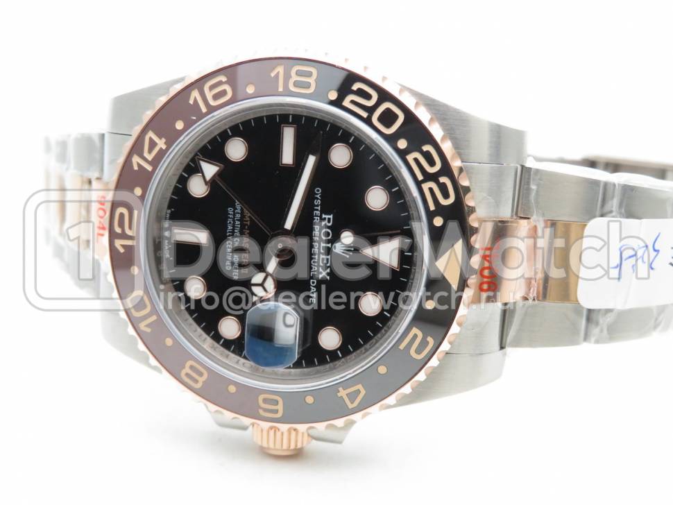 Циферблат чёрный. Позолоченные часовые риски и стрелки, покрытые люминесцентным составом Super LumiNova С3, зеленого свечения. Окно даты в отметке на 15.00 часов под увеличительным окном 2,5. Гравировка маркировки Rolex и серийного номера Rolex на внутреннем ранте. Сапфировое стекло, с антибликовым покрытием на увеличительном окне и гравировкой коронки Rolex на стекле в отметке на 18.00 часов. Двунаправленный, вращающийся коричнево-чёрный керамический безель, с часовыми метками времени GMT (при вращении безеля 24 щелчка).