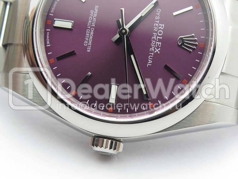 Циферблат красный (Red Grape), переливающийся. Полированные часовые риски и стрелки, покрытые люминесцентным составом. Сапфировое стекло с гравировкой коронки Rolex на стекле в отметке на 18.00 часов. Фиксированный в одном положении, стальной полированный безель.