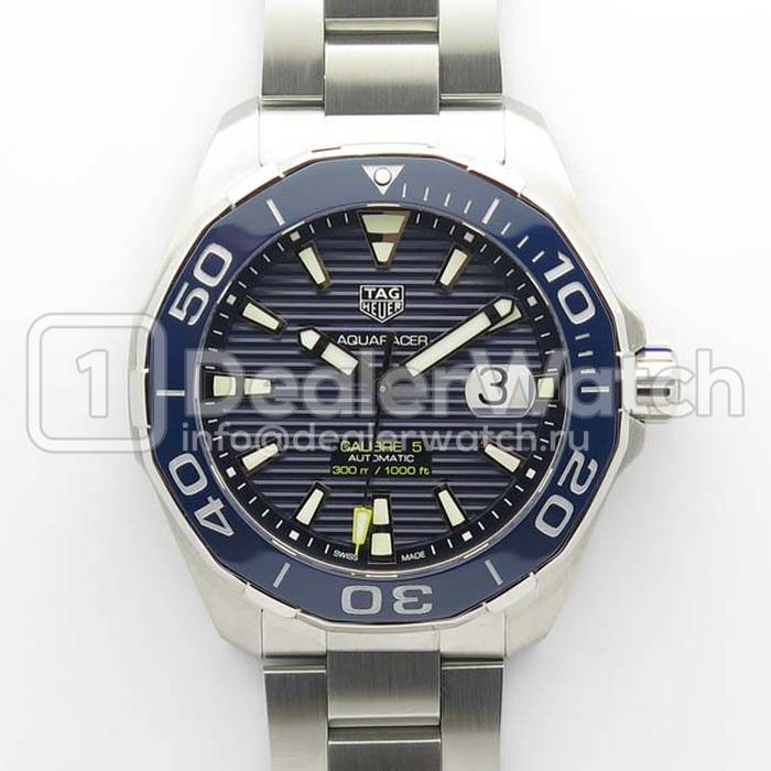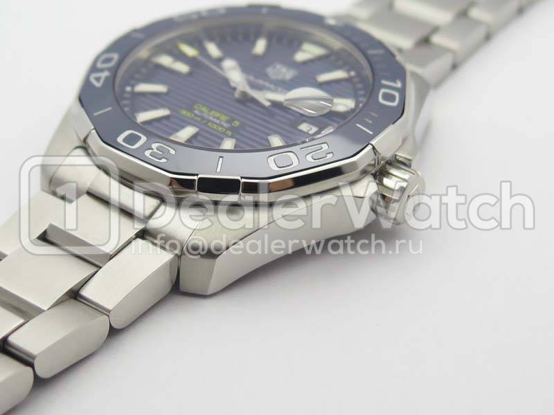 Корпус часов TAG Heuer Aquaracer 300M Calibre 5 имеет размеры 43 х 13 мм. Выпуклая завинчивающаяся задняя крышка из сатинированной стали и гравировкой по радиусу, с указанием серийного номера. Индивидуальный серийный номер. Водозащита часов 10 АТМ.