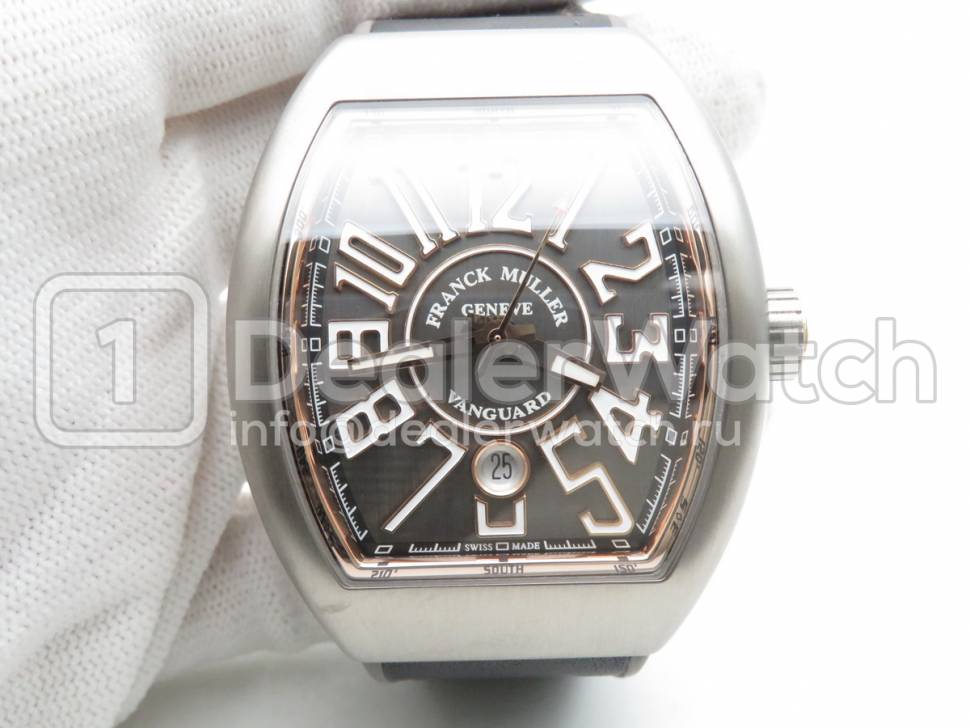 Корпус часов Franck Muller Vanguard V 45 Automatic Titanium имеет размеры 44 х 53,7 х 14 мм. Из сатинированной стали на 4 винтах и гравировкой по радиусу, с указанием серийного номера и номера референса. Водозащита часов 5 АТМ.