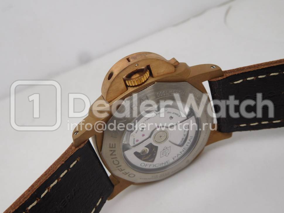 Корпус часов Officine Panerai Luminor Submersible 1950 3 Days Automatic Bronzo PAM 382 имеет размеры 47 x 18 мм. Завинчивающаяся, с сапфировым стеклом. Гравировка по радиусу титанового кольца, с указанием серийного номера и количественного номера экземпляра из лимитированной серии в 1000 экземпляров (N..../1000). Индивидуальный серийный номер. Водозащита часов 10 АТМ.